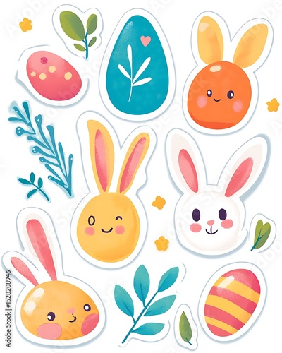 Obraz premium Cute Easter Sticker Pack with Bunnies, Eggs, and Carrots in Bright Pastel Colors