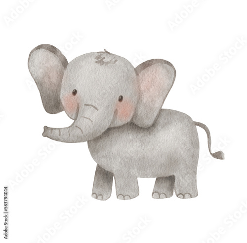 © Elena, Naklejka premium Cute elephant in cartoon style. Watercolor Drawing african baby wild animal isolated on white background. Jungle safari animal
