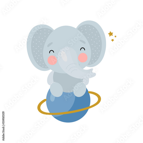 © Tatyana Khlopova, Obraz premium Cute Elephant in the space. Cartoon style. Vector illustration. For card, posters, banners, children books, printing on the pack, printing on clothes, fabric, wallpaper, textile or dishes.
