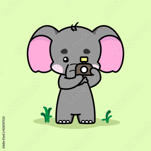 Naklejka premium Cute elephant is taking a picture. Cute elephant cartoon illustration isolated in green background. Vector illustration. Fit for mascot, children's book, icon, t-shirt design, etc