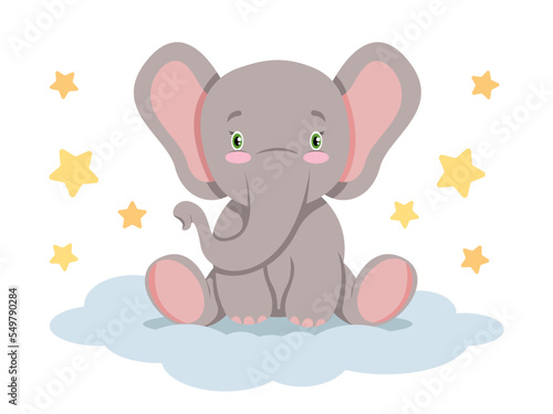 Fototapeta premium Cute elephant sitting on cloud with stars, cartoon illustration for kids.