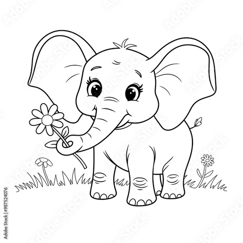 © Photo World, Obraz premium Cute elephant with flower in continuous line art drawing style. Minimalist black linear sketch isolated on white background for coloring book
