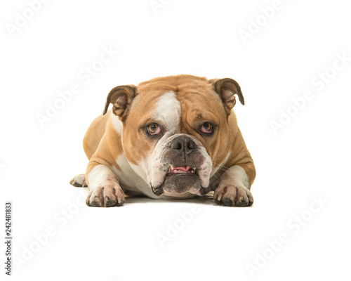 Fototapeta premium Cute english bulldog lying down seen from the front looking at the camera isolated on a white background