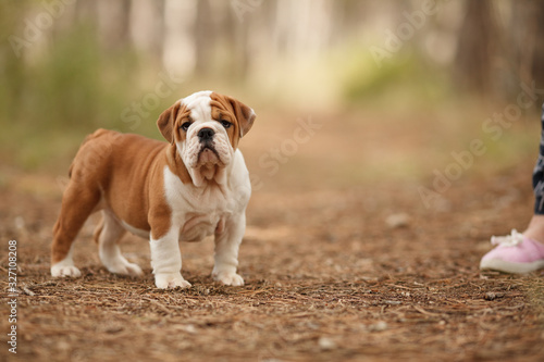 Obraz premium Cute English bulldog puppy of red and white color on a walk in the woods....
