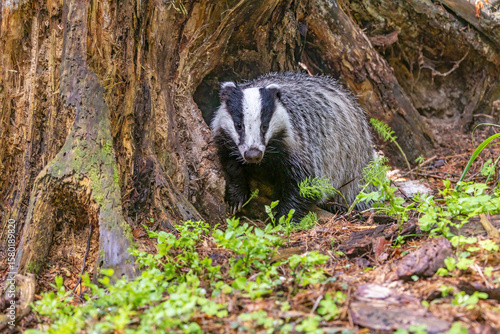 Obraz premium Cute European badger portrait in wildlife. Horizontally.