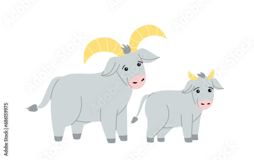 Fototapeta premium Cute farm animal. Colorful poster with two smiling goats. Mom and baby ram. Grazing agricultural cattle. Village or countryside. Cartoon flat vector illustration isolated on white background