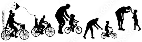 Fototapeta premium cute father and son silhouette, father and son learning to ride a bicycle, father day vector clipart collection illustration