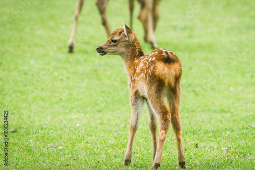 © Waranyu, Fototapeta premium Cute fawn in the short green grass field