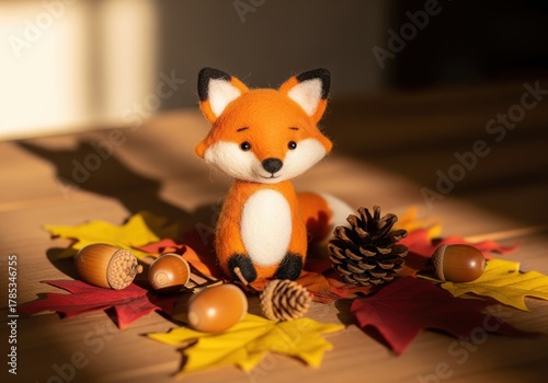 Fototapeta premium Cute felt fox figurine surrounded by autumn leaves, acorns, and pinecones on...