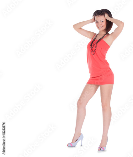 © Aleksandr Kurganov, Fototapeta premium Cute female in pink dress isolated over white