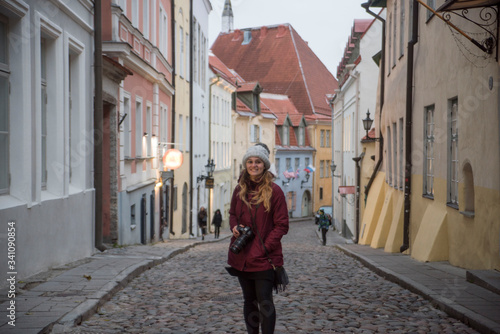 © Zach, Fototapeta premium cute female photographer walking down the old streets of telling estonia