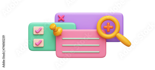 © chawalit, Fototapeta premium Cute file folder database or backup. Searching and storing documents online connect network. 3D Object magnifying glass, note paper computer data. 3D Illustration.