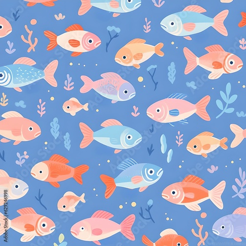 © Crowcat, Naklejka premium Cute fish repeat pattern, blue background , Generative AI