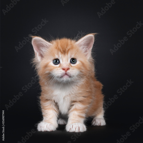 © Nynke, Fototapeta premium Cute five weeks old red silver Maine Coon cat kitten, standing facing front. Looking up towards camera with blue / greenish eyes. Isolated on back background.