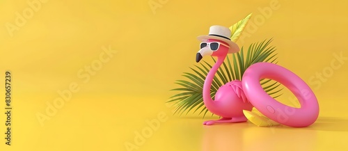 Obraz premium Cute Flamingo with Sunglasses and Hat on Inflatable Ring