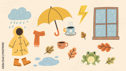 Fototapeta premium Cute flat illustration of rainy season essentials : raincoat, umbrella, boots, window, coffee, lightning, puddle, frog, and autumn leaves. Perfect for weather, kids, or seasonal design themes.