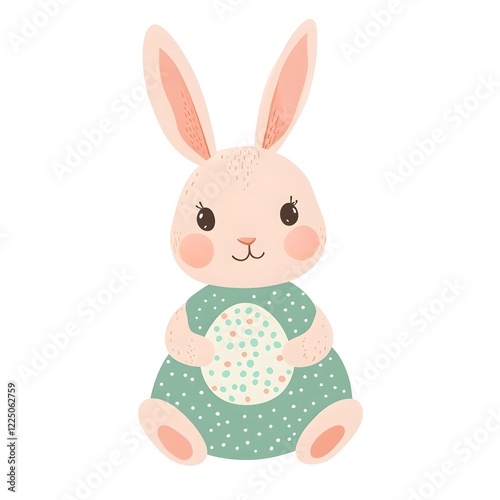 © Anca, Obraz premium Cute Flat Vector Bunny Holding Easter Egg – Minimalist Illustration in Green Polka Dot Dress
