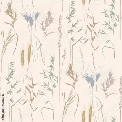 © garrykillian, Fototapeta premium Cute floral seamless pattern with silhouettes of meadow wild herbs flowers. Flower vector illustration background. Print in rustic vintage style, textile or wallpapers.