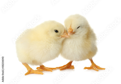 © New Africa, Obraz premium Cute fluffy baby chickens on white background. Farm animals