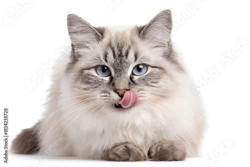 Obraz premium Cute fluffy cat with blue eyes licking its nose in a clean white background...