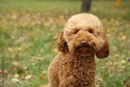 © New Africa, Fototapeta premium Cute fluffy dog in park, space for text