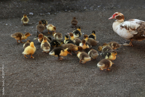 Fototapeta premium Cute fluffy ducklings with mother in farmyard
