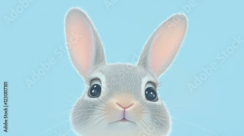 © BrightWhite, Obraz premium Cute fluffy Easter bunny with large expressive eyes, curious expression set against soft blue background, symbolizing springtime joy and celebration, ideal for festive themes.