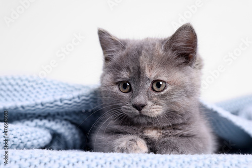 Fototapeta premium Cute fluffy kitten in light blue knitted blanket against white background