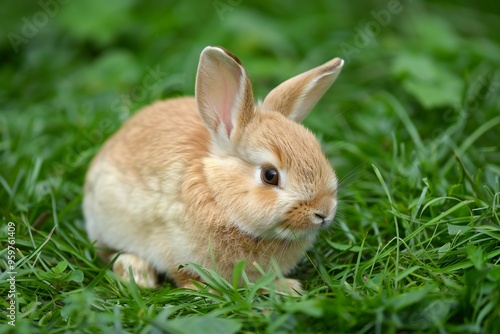 Fototapeta premium Cute fluffy little rabbit on a meadow grass field, created by ai