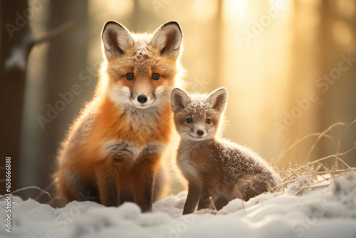 © MNStudio, Fototapeta premium Cute fluffy red mama fox and baby fox in snowy winter forest on sunny evening. Wild animals in nature.