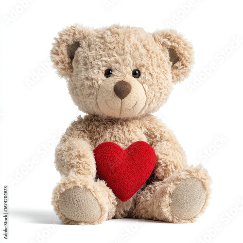 Obraz premium Cute fluffy teddy bear holding a red heart, isolated on a clean white background.