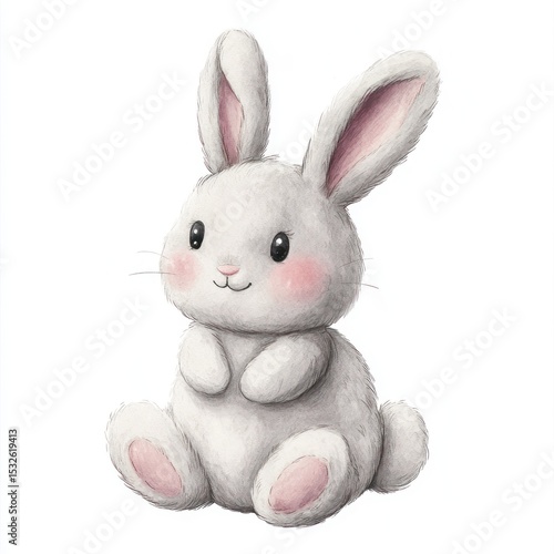 Obraz premium Cute, fluffy white bunny with pink cheeks and ears sitting against a white background