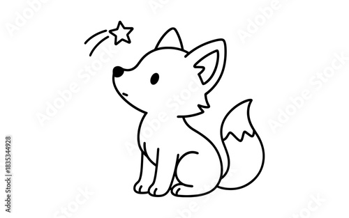 © 123levit, Obraz premium Cute fox cub sitting under a shooting star in adorable line art