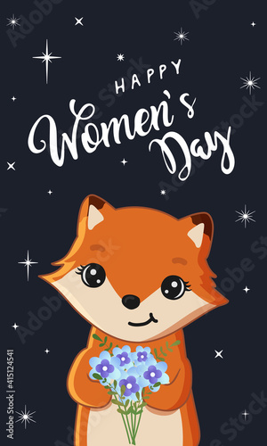 Fototapeta premium Cute fox holding bouquet. Funny animal. Happy Women's Day.