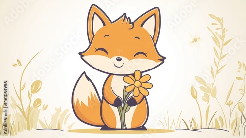 Obraz premium Cute fox holding flower in nature background. Possible stock photo use children's book illustration