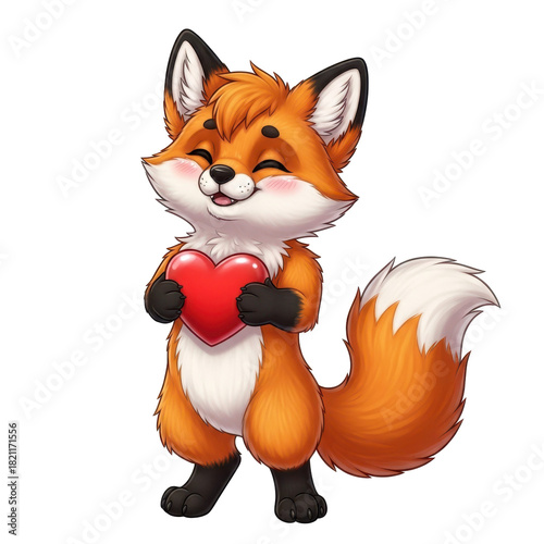 Obraz premium Cute fox offering heart: An adorable, cartoon fox with vibrant orange fur and a fluffy white tail cheerfully holds a big red heart, conveying love and warmth.