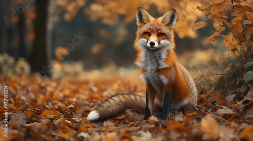 Naklejka premium Cute Fox Sitting Among Autumn Leaves