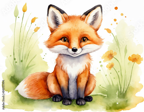 Obraz premium Cute Fox Sitting in a Watercolor Meadow