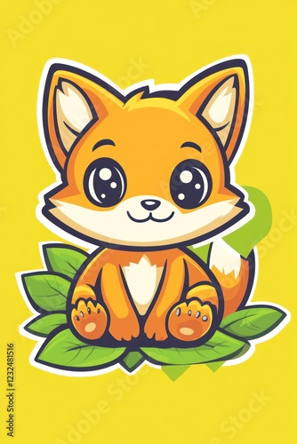 © Zeva, Fototapeta premium Cute fox sitting in leaves, yellow background, children's illustration
