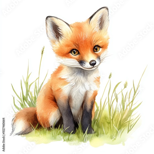 © ชัยธวัช ผาผง, Obraz premium Cute fox sitting in the grass, illustrated with vibrant colors.