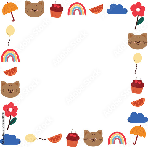 Obraz premium cute frame with drawing cartoon cat and cute stuff. cartoon doodle, object, frame border, hand drawing illustration