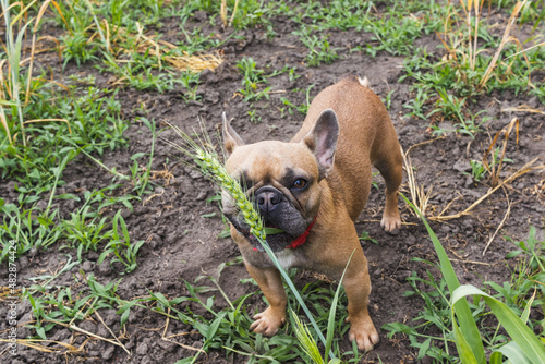 Obraz premium Cute french bulldog eats wheat grass in a garden
