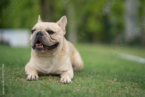 © tienuskin, Fototapeta premium Cute french bulldog is playing sitting down in the park to let it's owner taking the picture