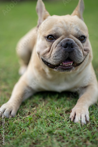 Obraz premium Cute french bulldog is posting picture in front of the owner.