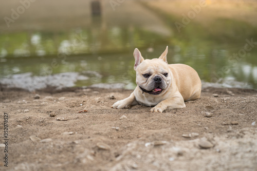 Obraz premium Cute french bulldog lying at dry ground against pond background.