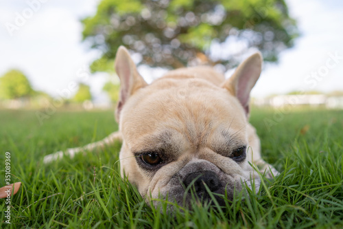 © tienuskin, Fototapeta premium Cute french bulldog lying on grass at park during morning walk