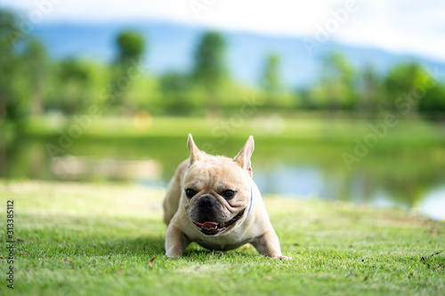 © tienuskin, Fototapeta premium Cute french bulldog relaxing in garden during the morning walk.