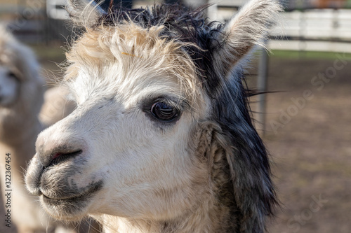 Obraz premium Cute friendly alpaca on an alpaca farm. Closeup of an alpaca face