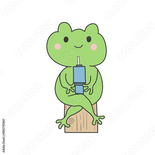 © adnan, Obraz premium Cute Frog Character Holding Thermos in Flat Cartoon Style