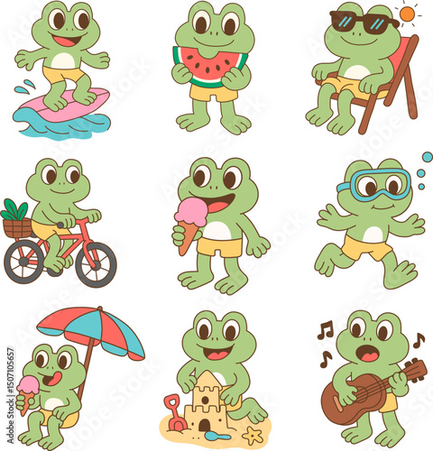 Obraz premium Cute frogs enjoying summer activities like surfing, biking, and playing music